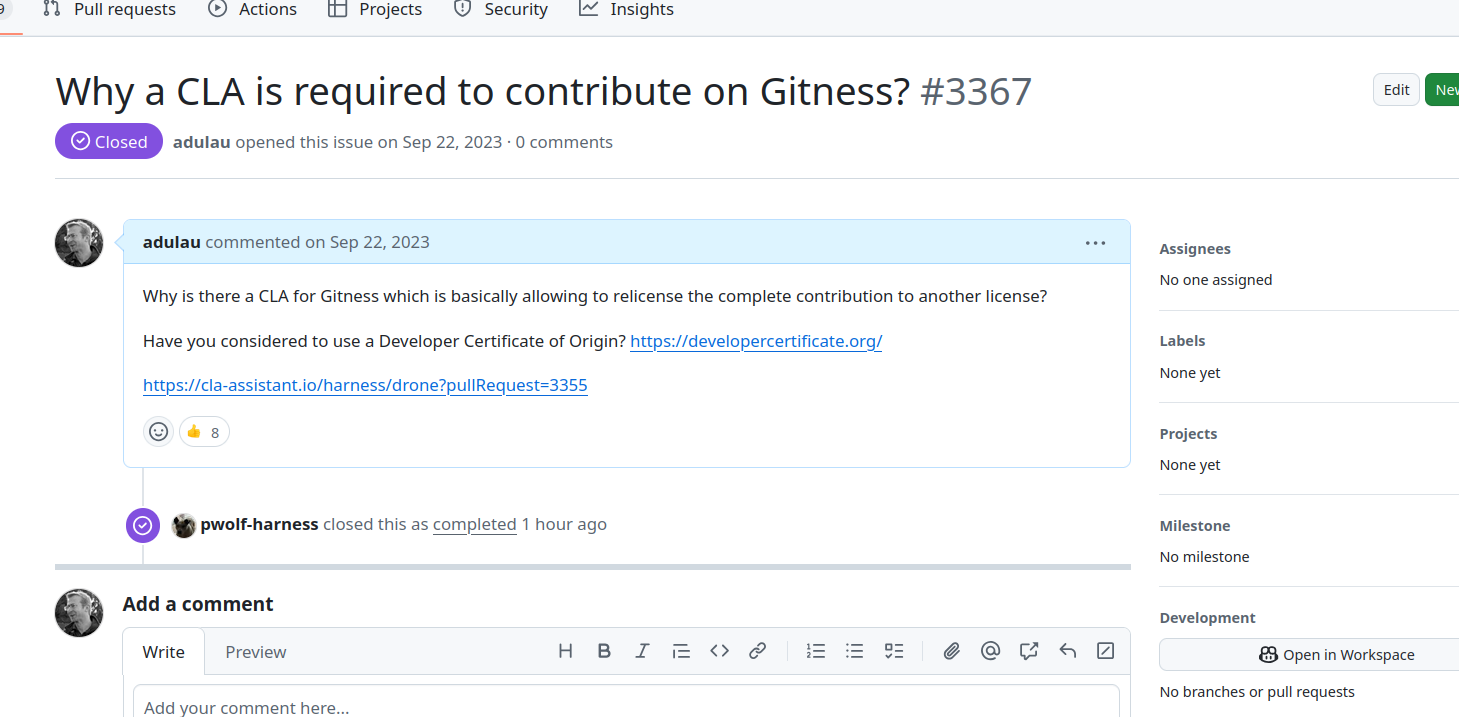 If you inquire about the CLA signing process for an open-source project and your question is closed without any explanation, what does that indicate about the future ?