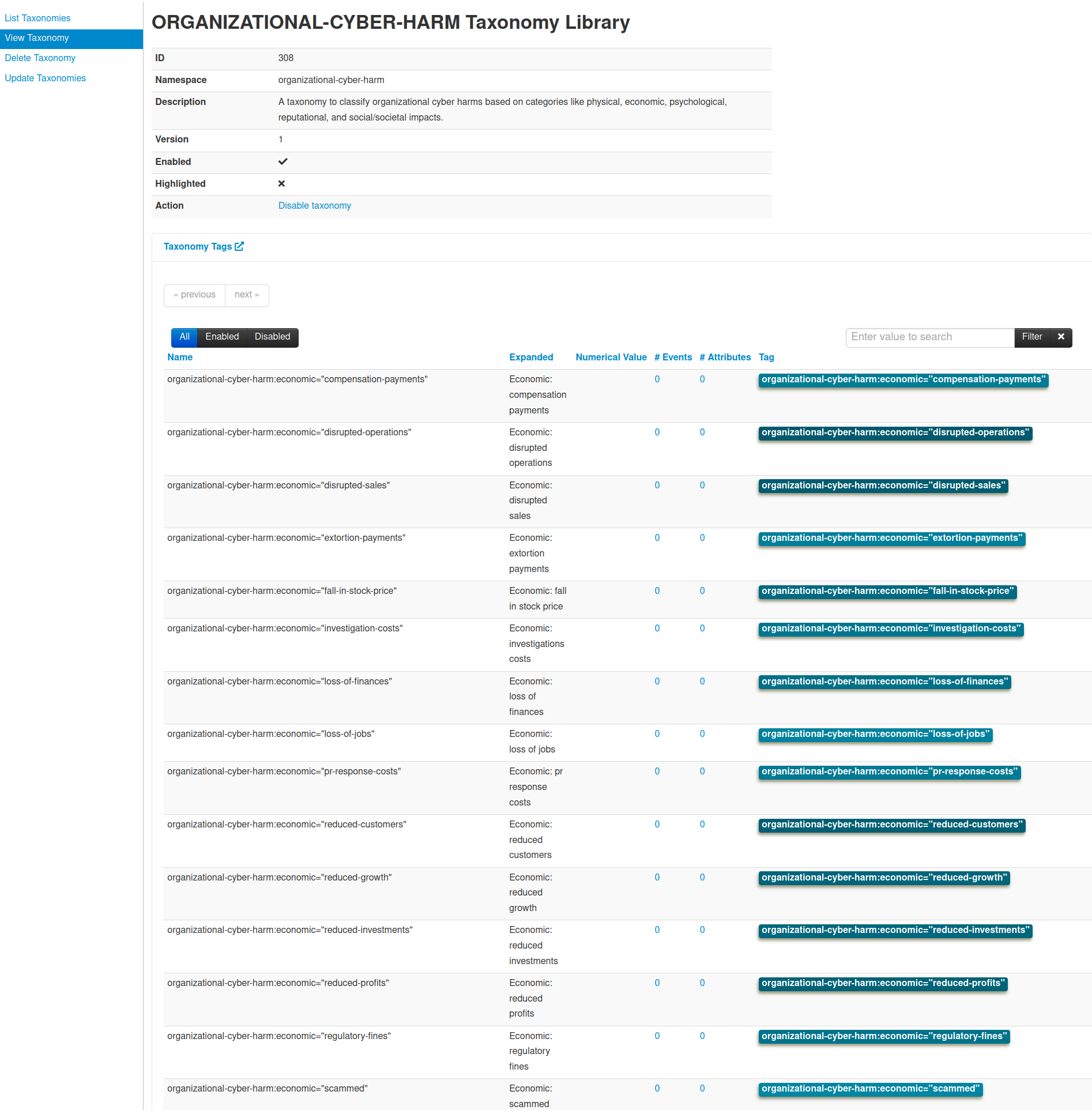 - MISP Taxonomy: organizational-cyber-harm - A taxonomy for classifying organizational cyber harms based on categories such as physical, economic, psychological, reputational, and social/societal impacts in MISP standard format.